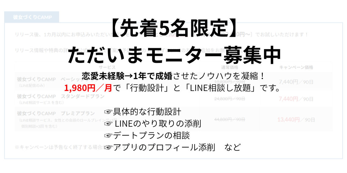 ※キャンペーン価格は、「彼女づくりCAMP」の正式リリースから1か月までのモニター価格となります。個別サポートは先行して受け付けております。